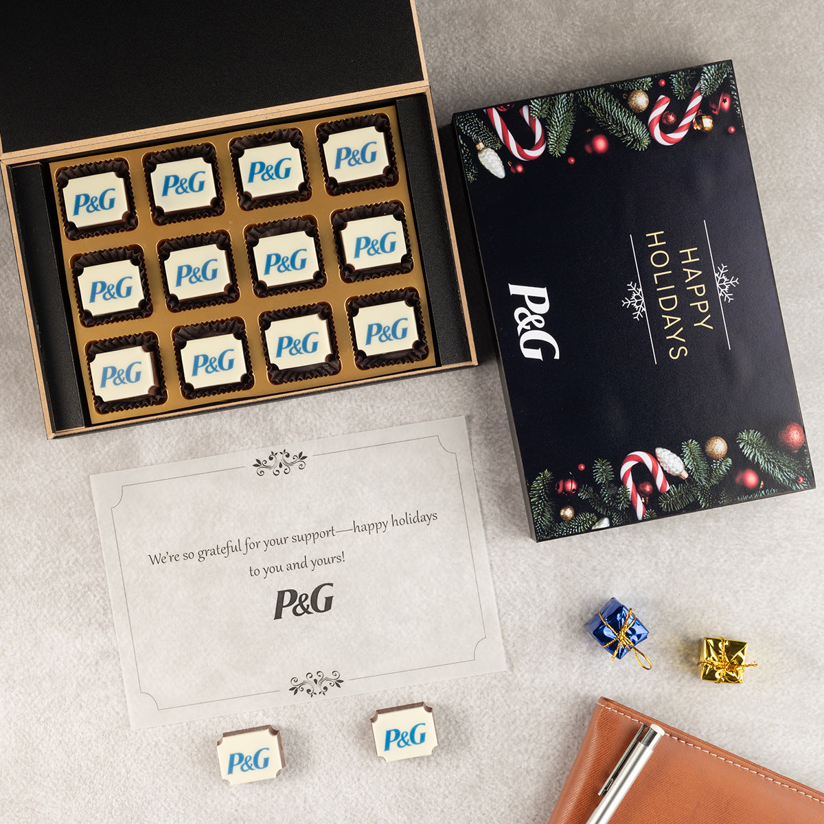 12 premium logo-printed chocolates presented in a branded wooden gift box, along with a personalized message.