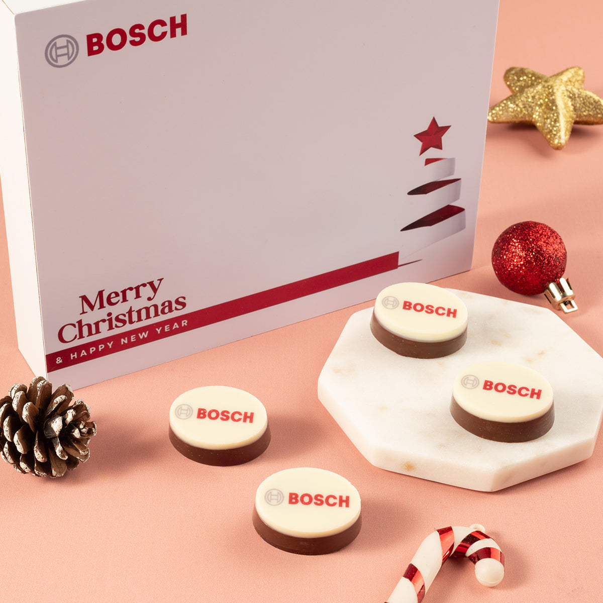 1) Chocolates: Crafted with premium Belgian couverture chocolate for a rich, silky-smooth taste, featuring high-clarity edible logo printing that showcases your brand beautifully without compromising flavor. 2) Box, Design & Message: Housed in a luxuriously finished MDF wooden gift box with rich festive artwork or your custom design. Includes a beautifully printed, personalized message to enhance emotional connection and elevate the unboxing experience. 3) Outer Packaging: Secure, insulated, and meticulously packed to protect quality and delivered perfectly. 4) Our Service: Professional handling with dedicated support from design mock-ups to on-time delivery — ensuring a seamless and enjoyable gifting experience.