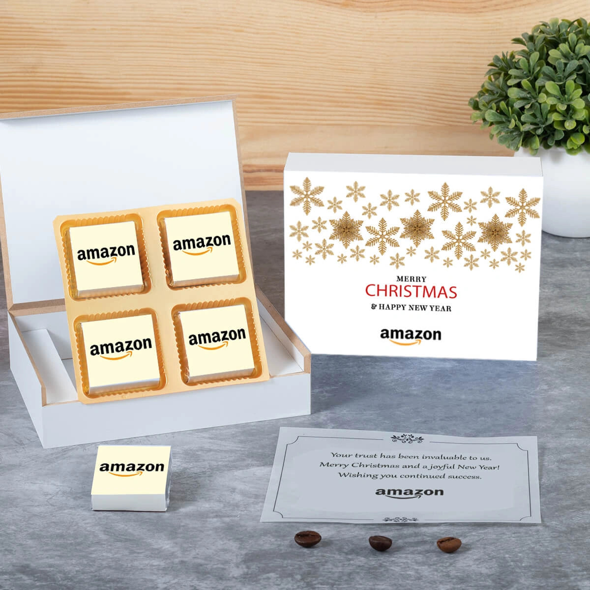 4 logo-wrapped chocolates in a branded wooden box with chocolates and a personalized butter paper message. - This product will be designed specially for the occasion of Christmas & New Year - Please see all box designs here.
