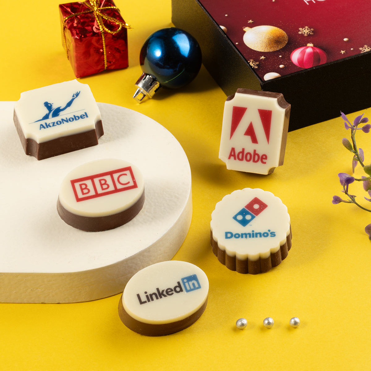 1) Chocolates: Crafted with premium Belgian couverture chocolate for a rich, silky-smooth taste, featuring high-clarity edible logo printing that showcases your brand beautifully without compromising flavor. 2) Box, Design & Message: Housed in a luxuriously finished MDF wooden gift box with rich festive artwork or your custom design. Includes a beautifully printed, personalized message to enhance emotional connection and elevate the unboxing experience. 3) Outer Packaging: Secure, insulated, and meticulously packed to protect quality and delivered perfectly. 4) Our Service: Professional handling with dedicated support from design mock-ups to on-time delivery — ensuring a seamless and enjoyable gifting experience.