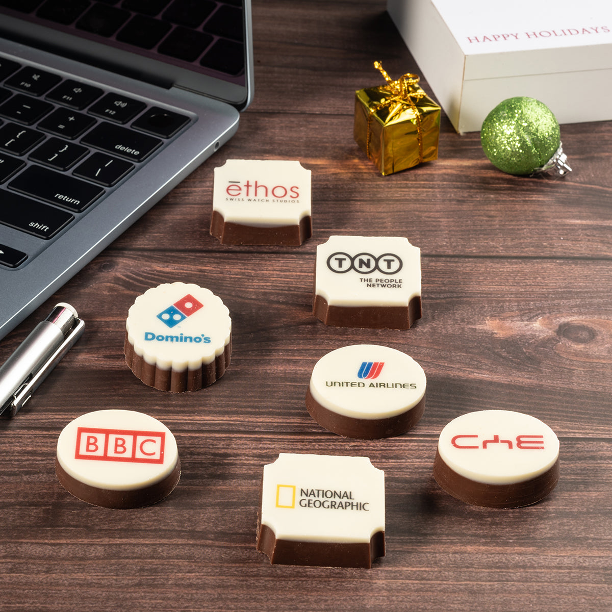 Six edible logo‑printed chocolates inside a sleek branded wooden box.