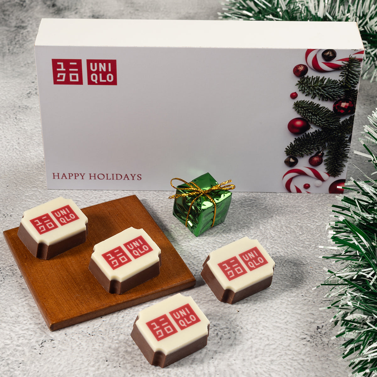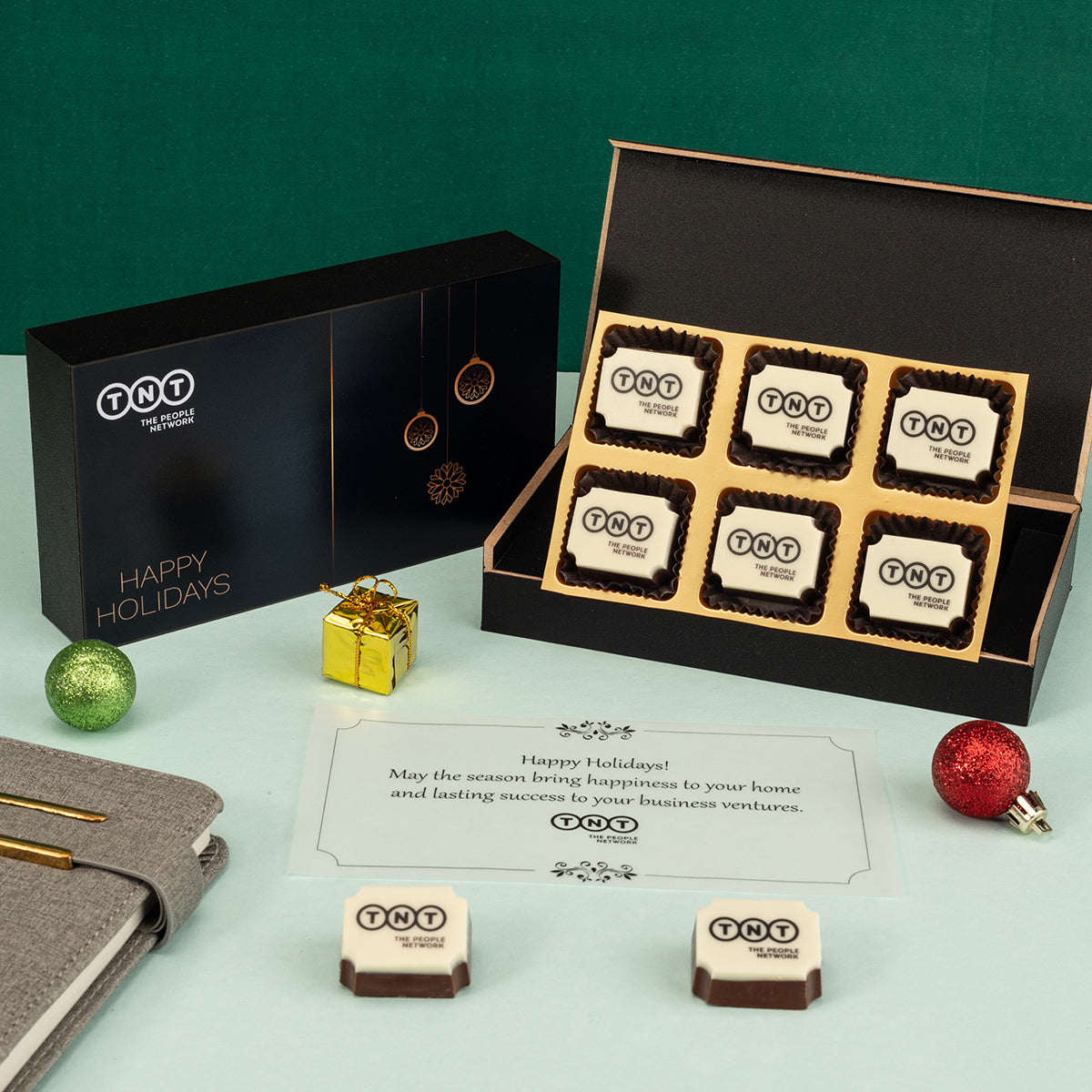 6 premium logo-printed chocolates presented in a branded wooden gift box, along with a personalized message.