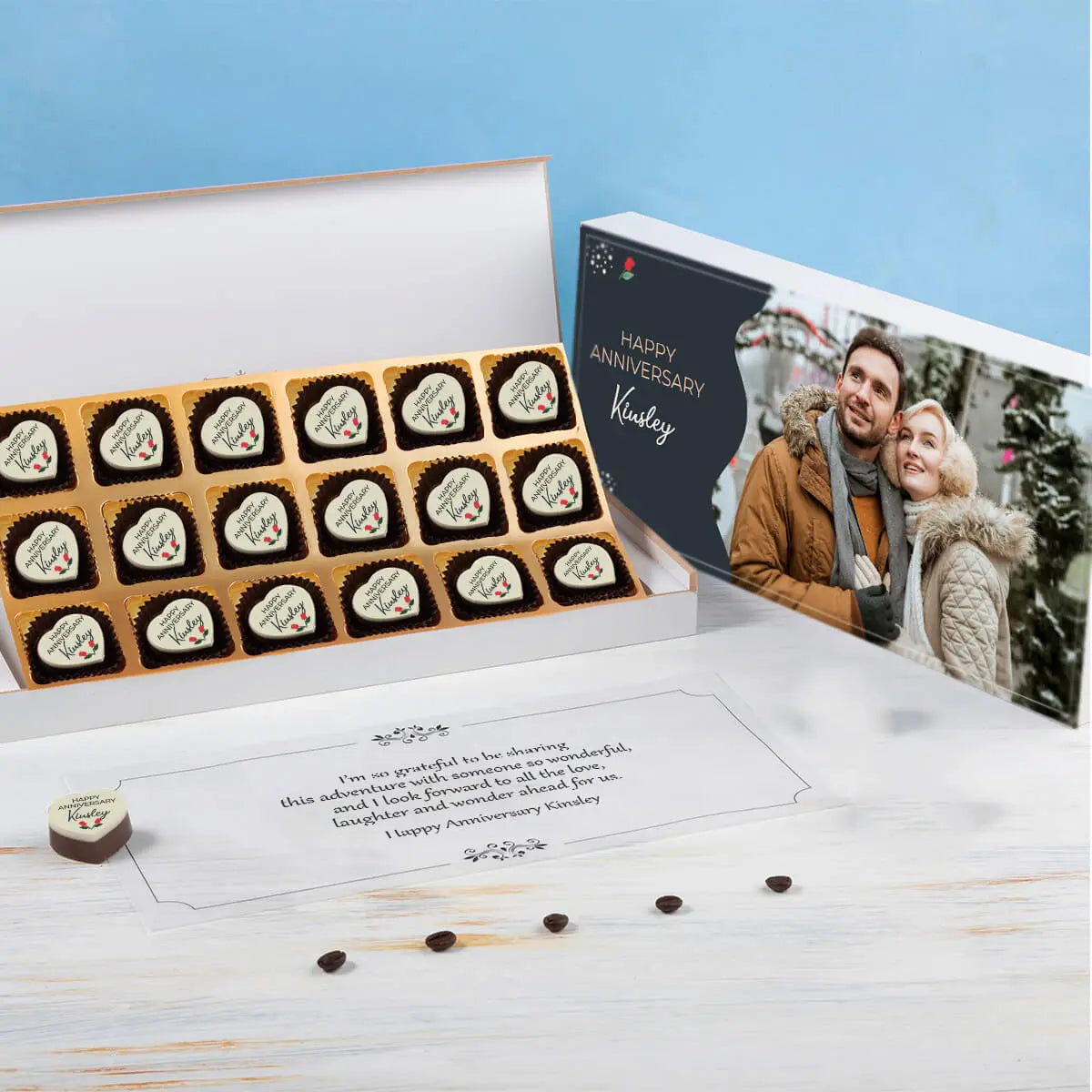 Includes name, photo, and heartfelt message directly printed on box and chocolates. |